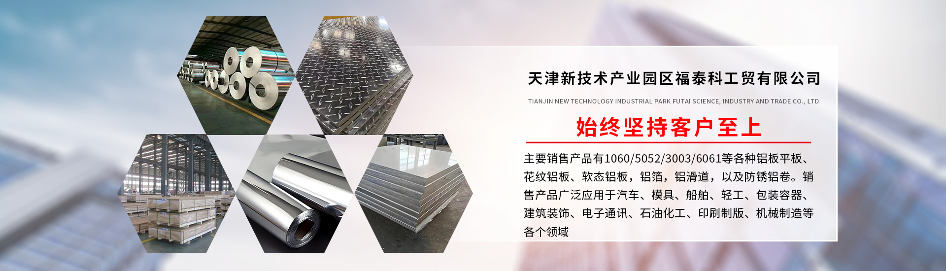 天津新技术产业园区福泰科工贸有限公司,简称:福泰铝业,成立于1997年,是一家质量过硬、诚信为本、经验丰富的中高端铝板销售企业。经过近三十余载的诚信经营,销售区域已辐射整个华北地区,以天津市、廊坊市、沧州市、石家庄市、保定市、唐山市、承德市、张家口市、北京市为主,以及内蒙古、辽西部分地区,以及山东北部西部、河北南部、河南北部、江苏部分地区,成为一家颇具实力的铝板经销公司。
